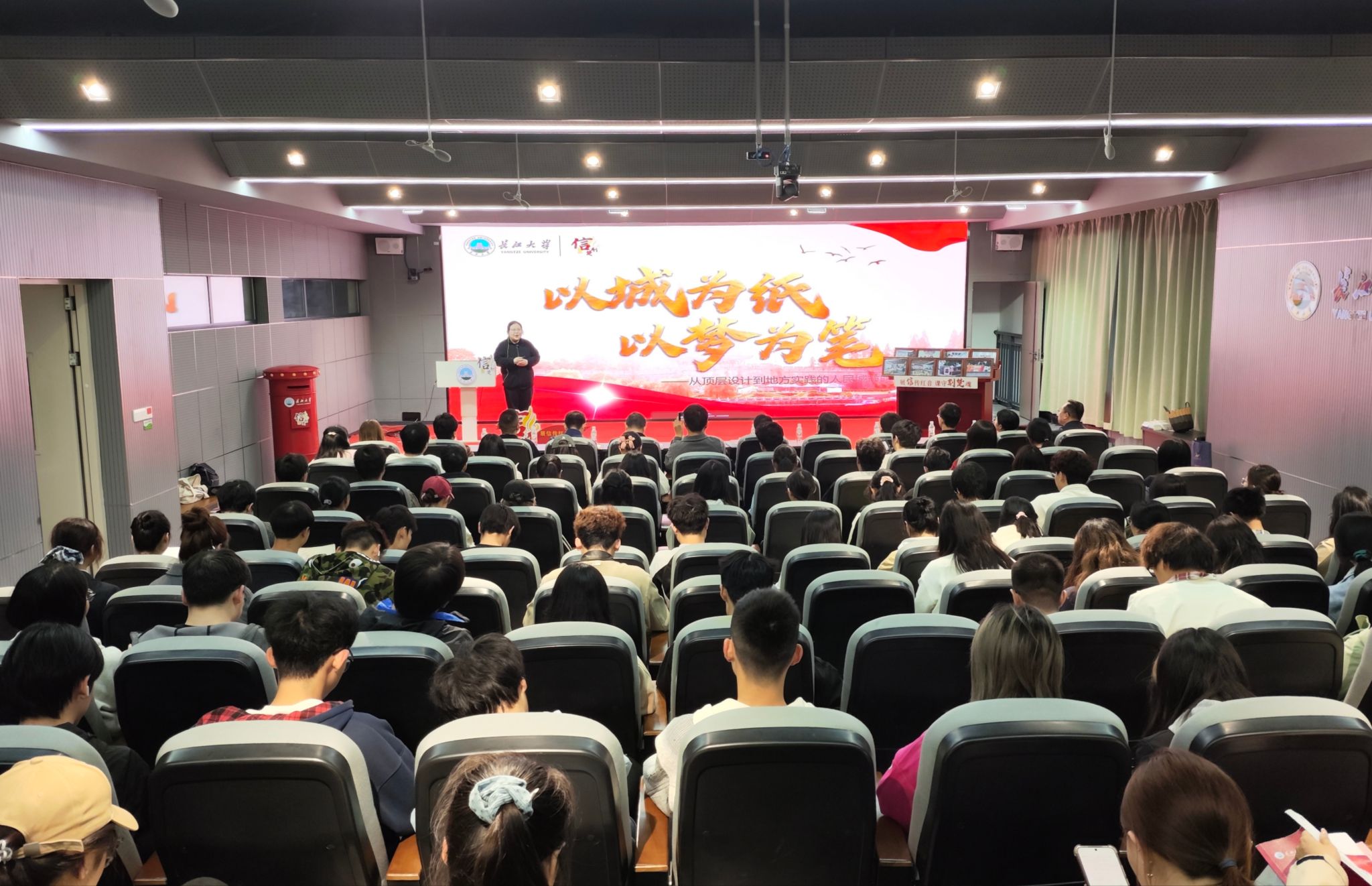 孙萌老师与学生代表陈玺翔、郑非凡、安洢锐等联袂讲授。孙萌以习近平总书记给上海市杨浦区“老杨树宣讲汇”全体同志的回信、荆州区融媒体中心致谢游客的信和共青团荆州市委给荆州籍学子的一封“家书”为线索,深入阐释了中央关于人民城市建设的重要精神,展现古城荆州在民生改善、城市更新等方面的生动实践,引导青年一代将个人理想与城市发展紧密结合。