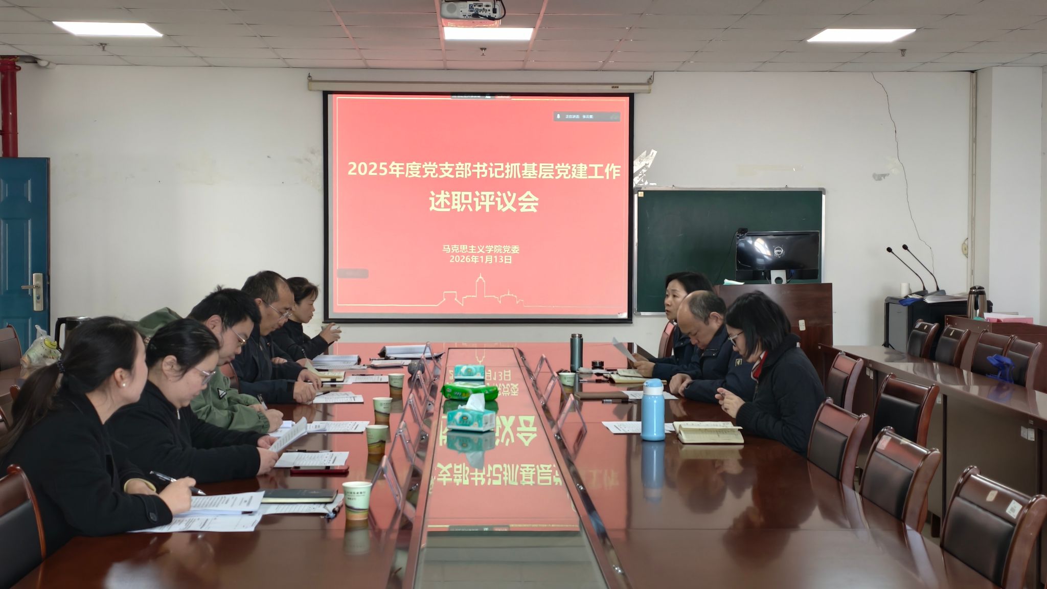 在文科楼1104室召开2025年度党支部书记抓基层党建工作述职评议会,全体班子成员和党支部书记参加会议。会议由学院党委书记刘小燕主持。