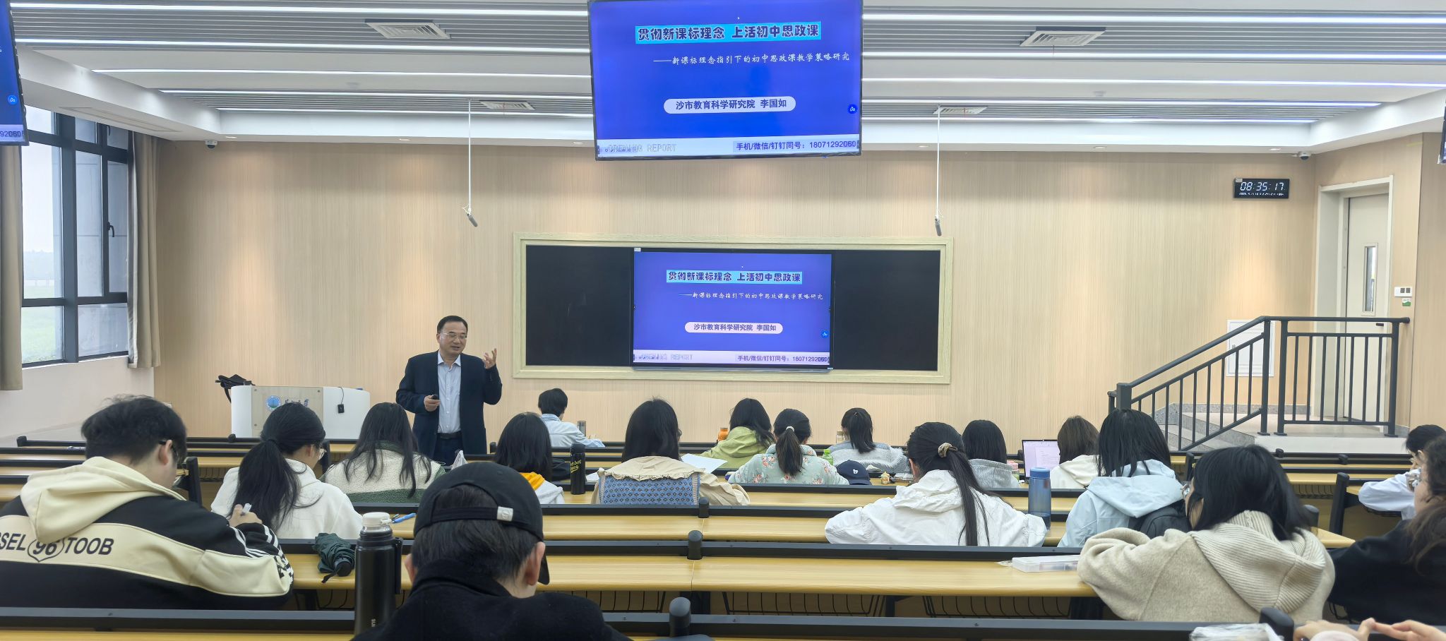 交流会上,李国如老师打破单向讲述的传统模式,以互动交流的形式开场,引导同学们结合自身学习与实践经历,分享对中学思政课教学的思考,充分调动了现场氛围,让大家在思维碰撞中快速进入交流状态。随后,李老师结合新课标要求与近年教材相关信息,系统梳理了中学思政课的教学背景与发展趋势,帮助同学们把握当前思政教育的改革方向与核心要求。