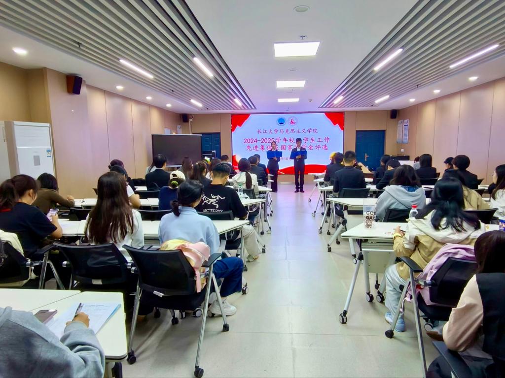 在文科楼1008室举行2024-2025学年标兵班集体暨本科生国家奖学金评选答辩会。学院党委书记刘小燕、党委副书记竺正海、学工办主任张云雾、辅导员邓鹏,思政12401班班主任饶玲、思政12402班班主任陈思杭、思政12301班班主任孙萌,学生代表唐佳雨、胡晟杰共同担任评委,2025级全体本科生与会观摩。答辩会由万鑫怡、尹家荣主持。